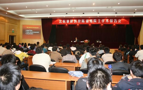 聘任仪式结束后,陈祖煜院士结合“5.12”汶川地震抗震救灾中的经历,在如心大报告厅为北航师生做了题为《汶川地震,建筑物破坏和次生灾害——调查和思考》的学术报告,从专业角度分析了汶川发生地震和次生灾害的状况、机理,以及对人类的影响,提出了人类“如何应对地震,设计更好的建筑物”的课题。陈院士的报告充满了对汶川人民的热爱和浓厚的爱国主义情怀,感人至深,意味深长。