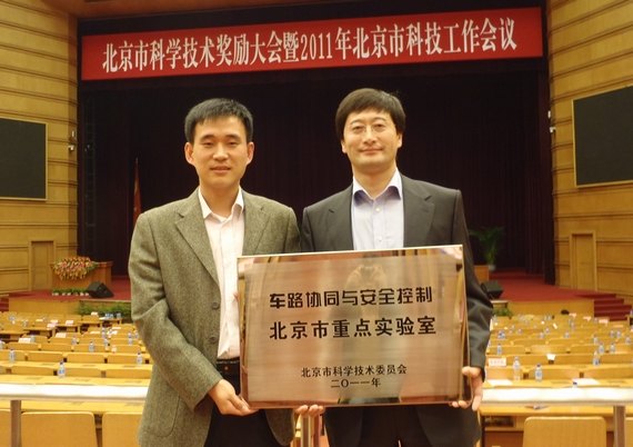 4月28日下午,北京市政府在北京会议中心召开“北京市科学技术奖励大会暨2011年北京市科技工作会议”。会上颁发了2009年度北京市科学技术奖,并为市级工程技术研究中心及重点实验室授牌。北京市委书记刘淇、市长郭金龙等领导出席会议。公司“车路协同与安全控制北京市重点实验室”主任王云鹏教授代表实验室参加授牌仪式。