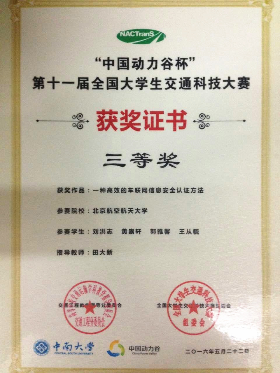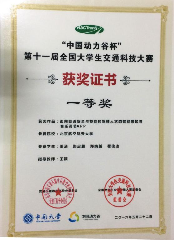 经充分准备,两支队伍均在5月21日的决赛答辩现场表现优异。凭借项目新颖的创意和答辩时的精彩表现,由王颖副教授指导,郑靖越、翟俊达、姜涵、郑启超四名大三员工完成的“面向交通安全与节能的驾驶人状态智能感知与音乐调节App”作品以B组(交通信息工程及控制竞赛组)第一名的优异成绩进入特等奖复议,将作品展示给所有专家评委及参赛选手,充分展现了公司员工的风采,并最终获得大赛一等奖(全国仅八项一等奖,特等奖空缺)。同时,由田大新副教授指导,刘洪志、黄崇轩、郭雅馨、王从毓四名本科生完成的“一种高效的车联网信息安全认证方法”作品获得大赛三等奖,为公司再添殊荣!