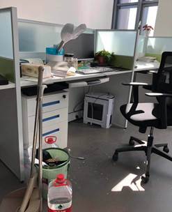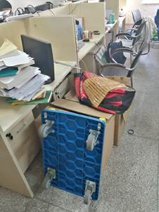 西配楼605 堆放杂物,工位桌面物品杂乱
