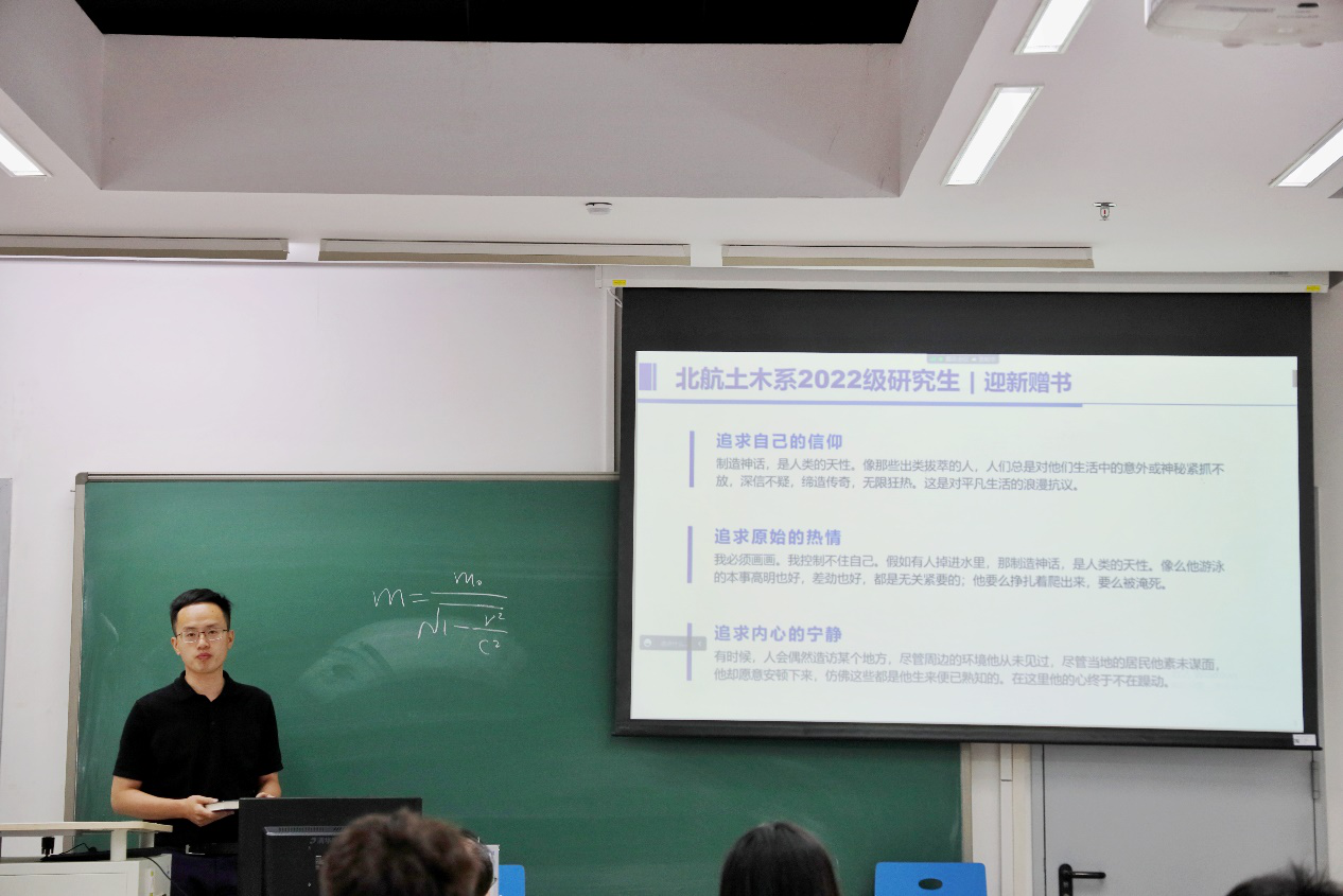 士嘉书院经理,国家“973计划”首席科学家姚仰平老师和新生们分享了自己工作和生活经历和体会,并提出殷切嘱托。他表示作为北航土木的员工,在行业面临转型升级挑战的大背景下,要不断提升自己的竞争力,努力成为怀揣梦想、自强不息、敢为人先的新时代杰出青年。特别强调了对于研究生生涯要做好时间规划,在科研过程中要注重培养自己的创新精神和创新能力,力争以两倍于常人的努力去工作,才能取得更大的进步和成就。