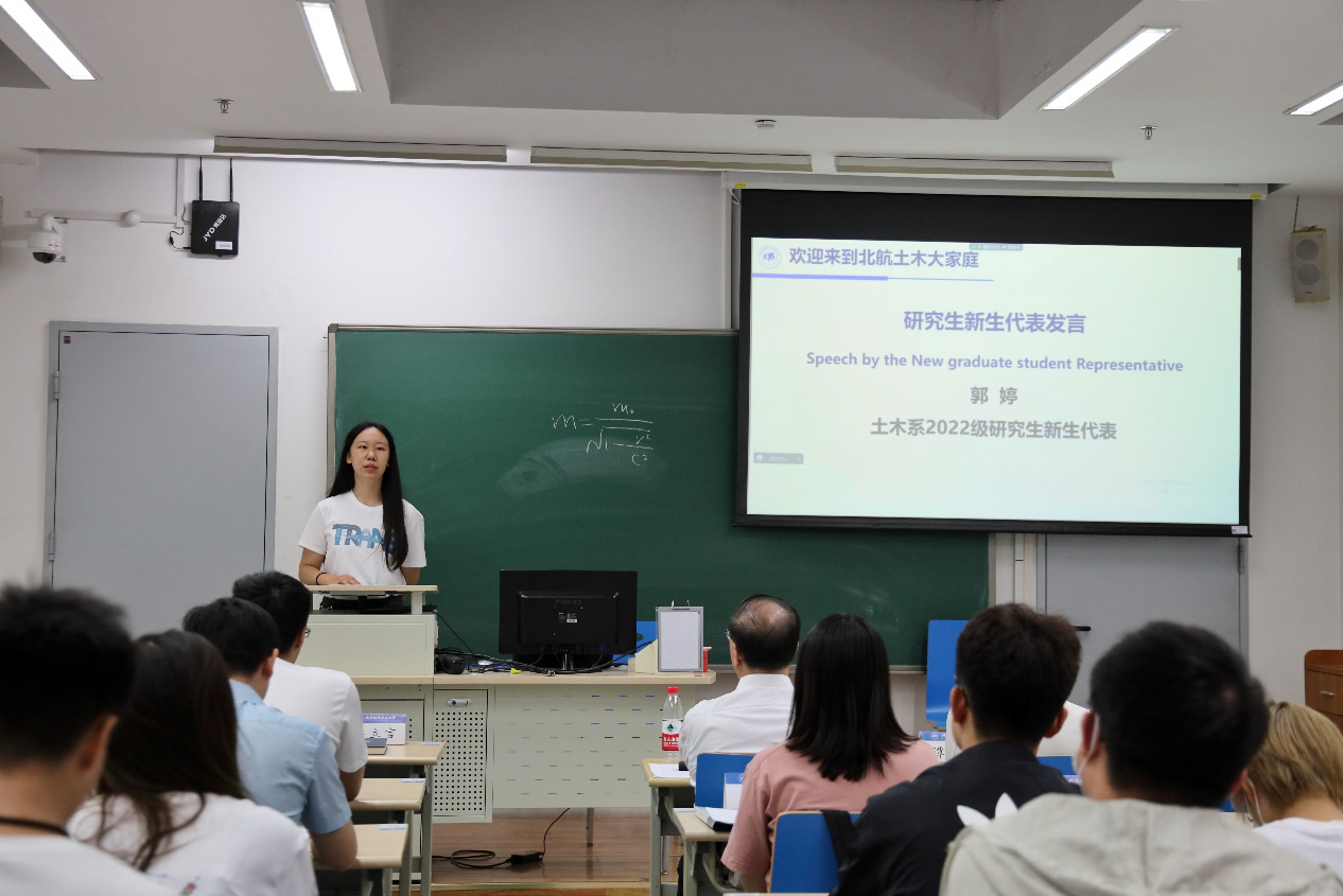 土木系2022级研究生郭婷作为新生代表发言。她提到在未来的科研和生活中,要心怀家国,不负时代,敢于挑战新的领域。通过直面挫折,把握当下,做好小事,从而汇聚点滴积累的力量。最后也倡导大家加强自身道德修养,做一个正直、诚信的学术人。