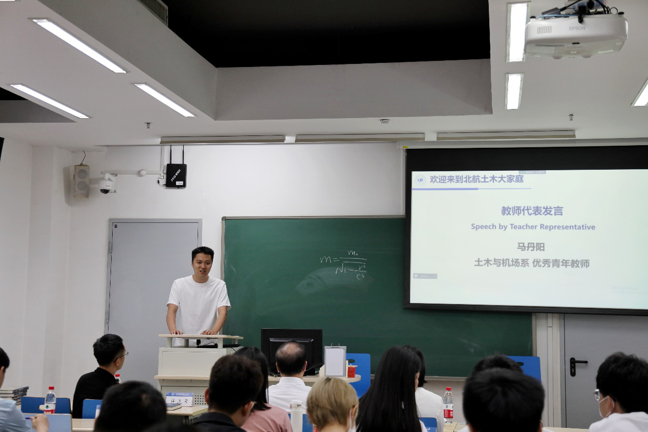 马丹阳老师作为教师代表分享了他初入北航的感受,也对新生给予真切的期望。他谈到研究生阶段的两个关键词:探索和专注。鼓励大家源于对未知事物的好奇不断,同时聚焦具体的研究方向保持专注,争取做别人没有做、做不了的研究,从而在北航留下追求进步、不懈奋斗的最美模样。