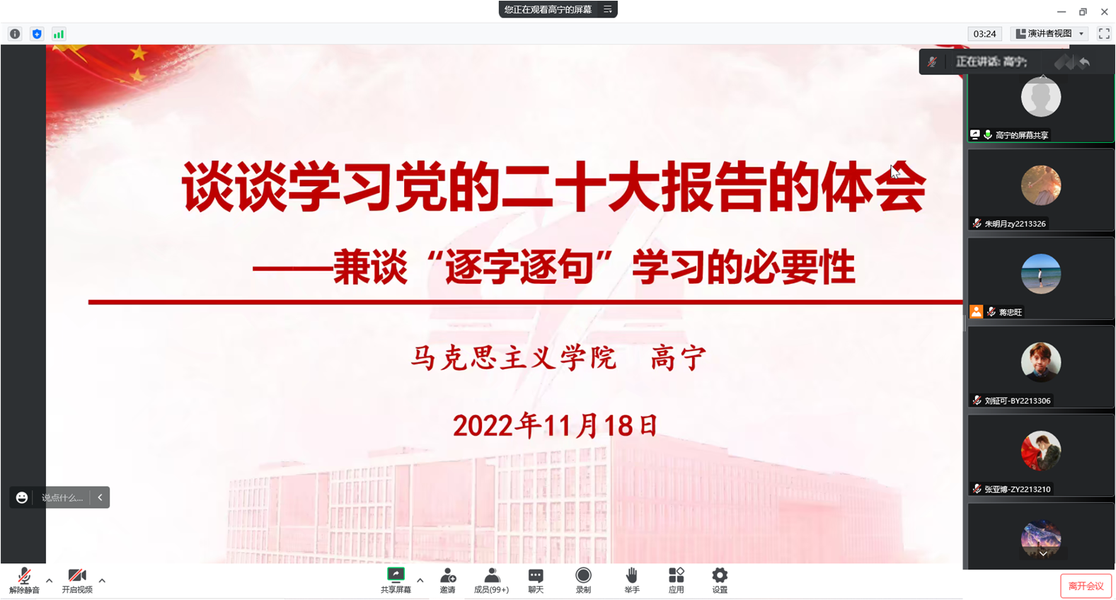 11月18日下午,公司党委线上组织开展“学习党的二十大精神”师生专题学习日活动,邀请马克思主义公司党委书记高宁教授带来题为“谈谈学习党的二十大报告的体会”的主题报告,公司党委书记韩慧瑜线上出席,公司师生代表近300人共同在线聆听学习。报告会由公司党委副书记郭祖博主持。