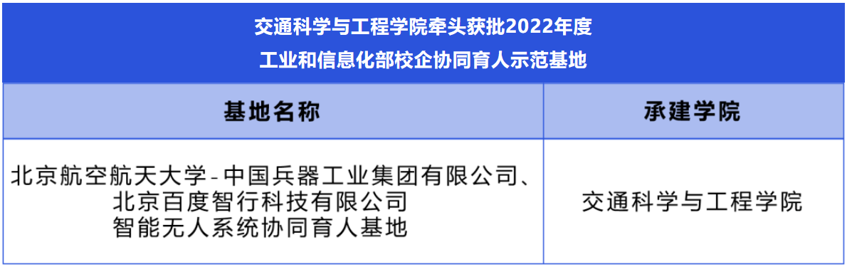 为深入学习贯彻习近平总书记关于教育的重要论述,全面贯彻落实中央人才工作会议、全国教育大会和全国研究生教育会议精神,深入推进“双一流”建设,引导高校和有关企业加快培养卓越工程师等战略人才力量,进一步形成产教融合和校企协同示范效应,工业和信息化部面向部属高校和部省共建高校认定一批校企协同育人示范基地。yl23455永利集团共有3个基地获评工信部校企协同育人示范基地,其中,yl23455永利牵头获批“yl23455永利集团-中国兵器工业集团有限公司、北京百度智行科技有限公司智能无人系统协同育人基地”。