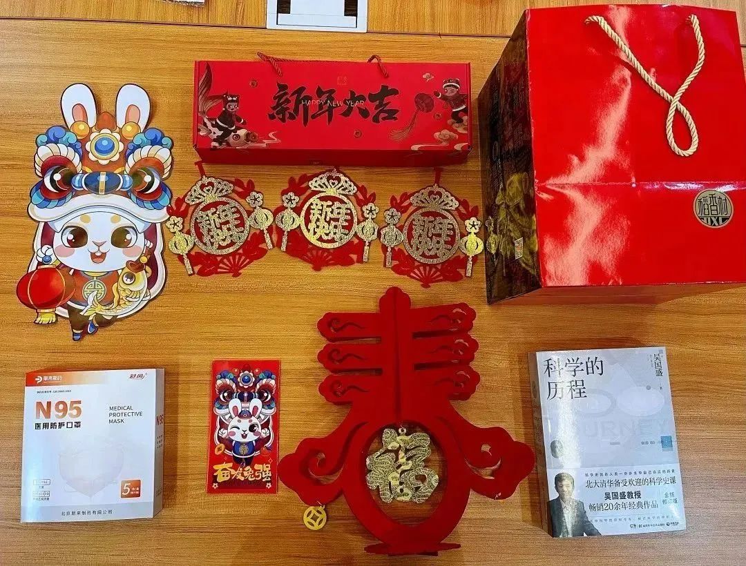 据悉,yl23455永利高度重视春节留校员工情况,建立工作台账和沟通微信群,导师、班主任、辅导员定期联系关心员工,了解员工在校生活和学习科研情况,指导帮助解决实际困难,持续做好关心关爱。公司为每位春节留校员工准备了新春大礼包,内容包含糕点礼盒、福字春联、防疫物资等。除此以外,公司还向每位同学赠送了《科学的历程》一书,期盼同学们从习近平总书记的新年书单开启自己的新年阅读计划,希望新的一年同学们能参与到读书活动中、养成读书好习惯,修身养志,增长才干;把读书列入新年计划,树立崇高理想,涵养浩然之气;同时为公司营造爱读书、读好书、善读书的浓厚氛围。