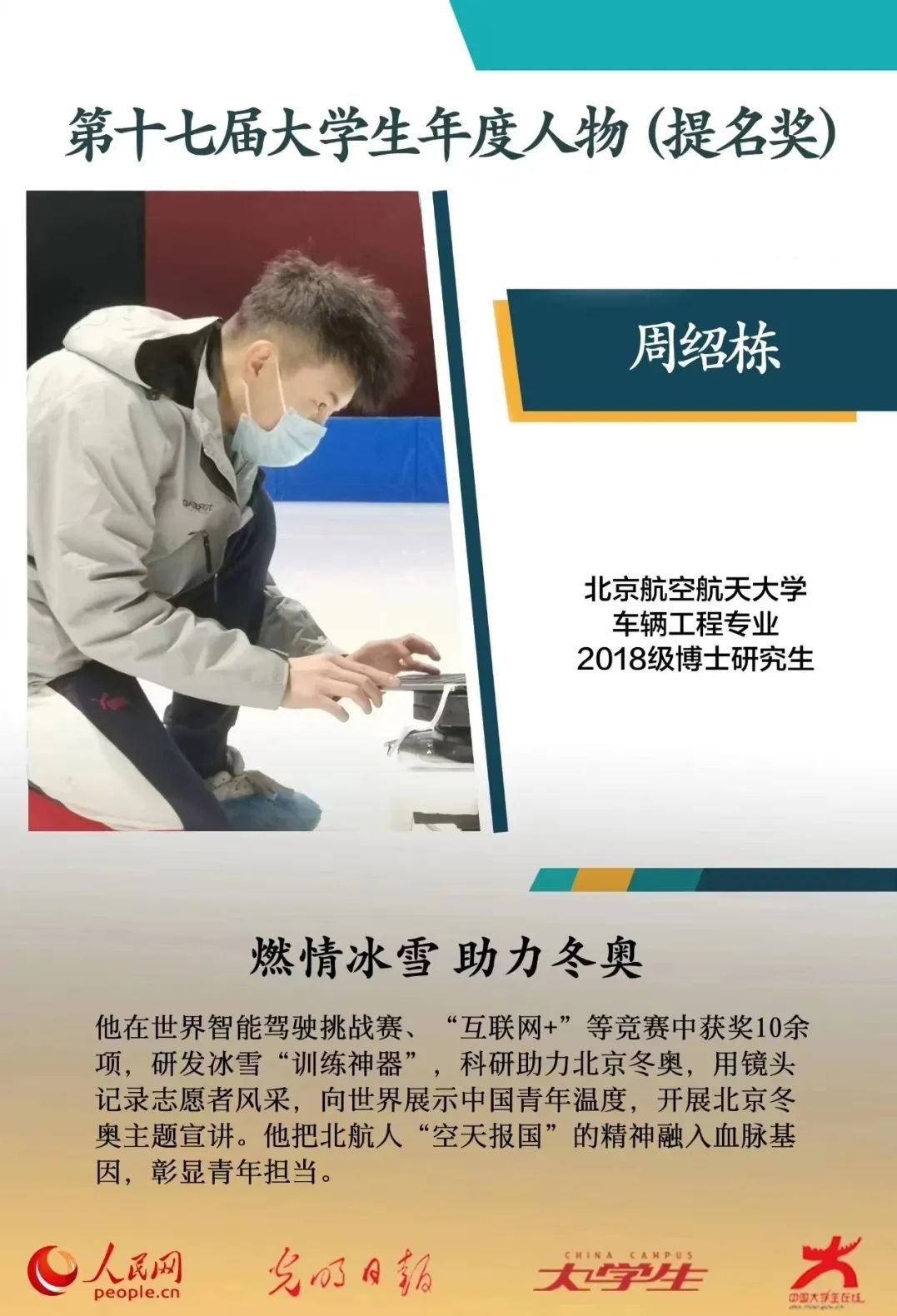 他勇于担当、乐于奋斗,在青春赛道上努力奔跑、全面发展;他潜心科研、迎难而上,在冬奥的赛场上与团队一起攻坚克难,做国有所需、心有所向的科研工作者;他不负韶华、甘于奉献,近4万条影像素材、20余部VLOG作品,做传递冬奥精神,尽展青年担当的记录者;他仰望星空,脚踏实地,牢固树立理想信念,做德才兼备,知行合一的践行者。