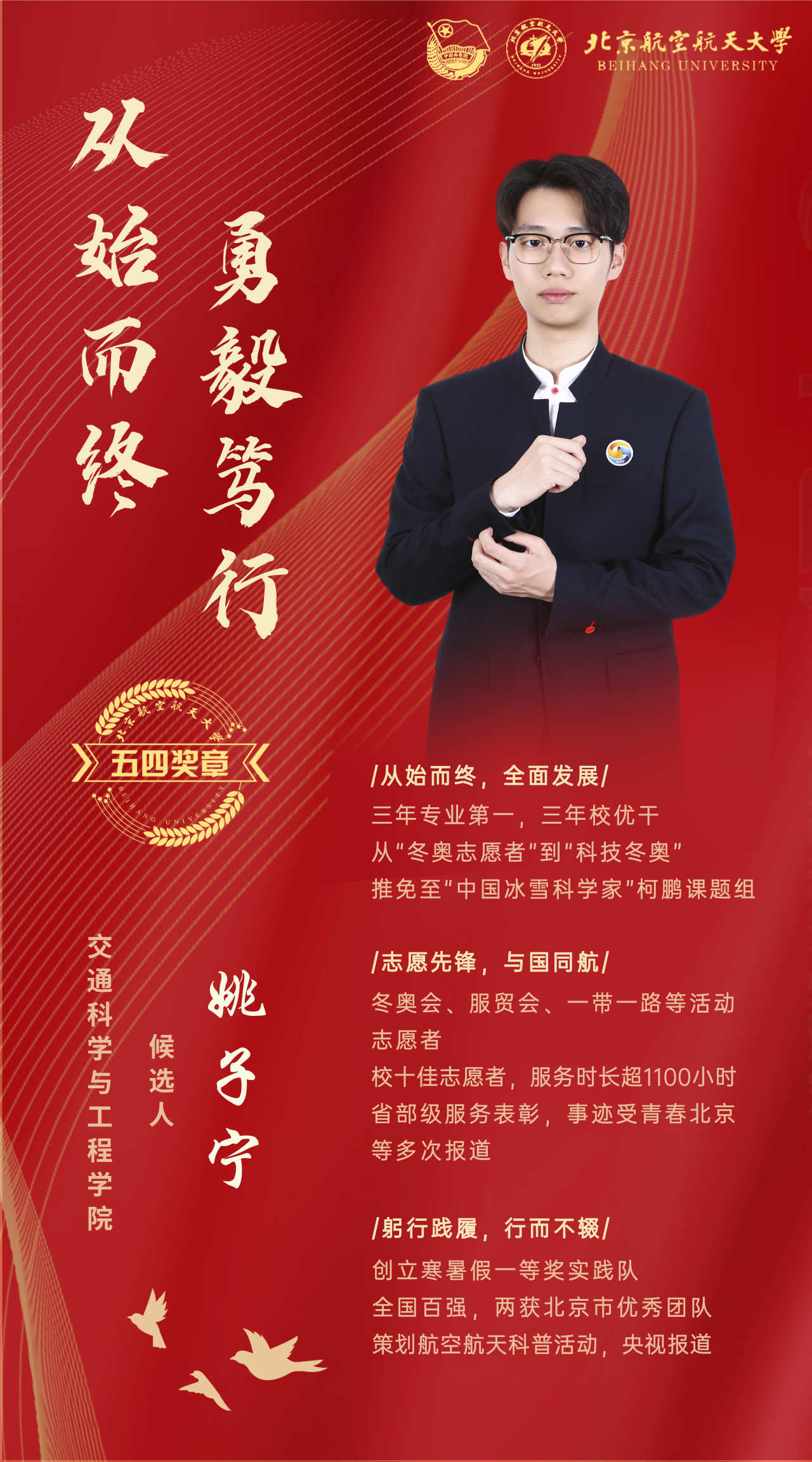 躬行践履,行而不辍。姚子宁同学担任公司分团委志愿服务部部长、员工中心奖助办公室奖助助理等职务,连续三年获评校优干;积极投身社会实践,团队获评全国百强、北京市优秀团队等荣誉;策划航空航天科普活动,获央视报道;记录青年形象的自媒体播放超60w。