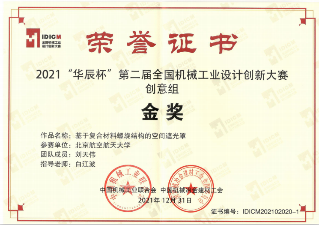 金奖荣耀,科创佳绩。刘天伟同学荣获全国机械工业设计创新大赛金奖2项,在1000多件作品中以2%的比例脱颖而出;助力硕士生和本科生参加多项重要赛事,包括交通运输科技大赛、中国航空创新创业大赛、复合材料智能技术创新大赛以及冯如杯竞赛等,取得了优异的成绩。