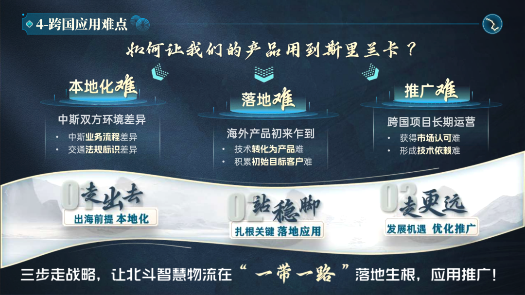斯里兰卡地理位置处于“一带一路”关键节点,科伦坡港作为其第一大港口在世界海运中地位重要。面对海外技术移植复杂、跨国应用落地困难等挑战,本团队以自主研发的北斗/GNSS智慧物流运输综合信息系统为基础,联合中斯两国智慧物流领域顶尖企业和高校,从技术、本地化应用、推广模式等方面全方位着手,创新性地提出并践行海外落地推广“三步走”方案。