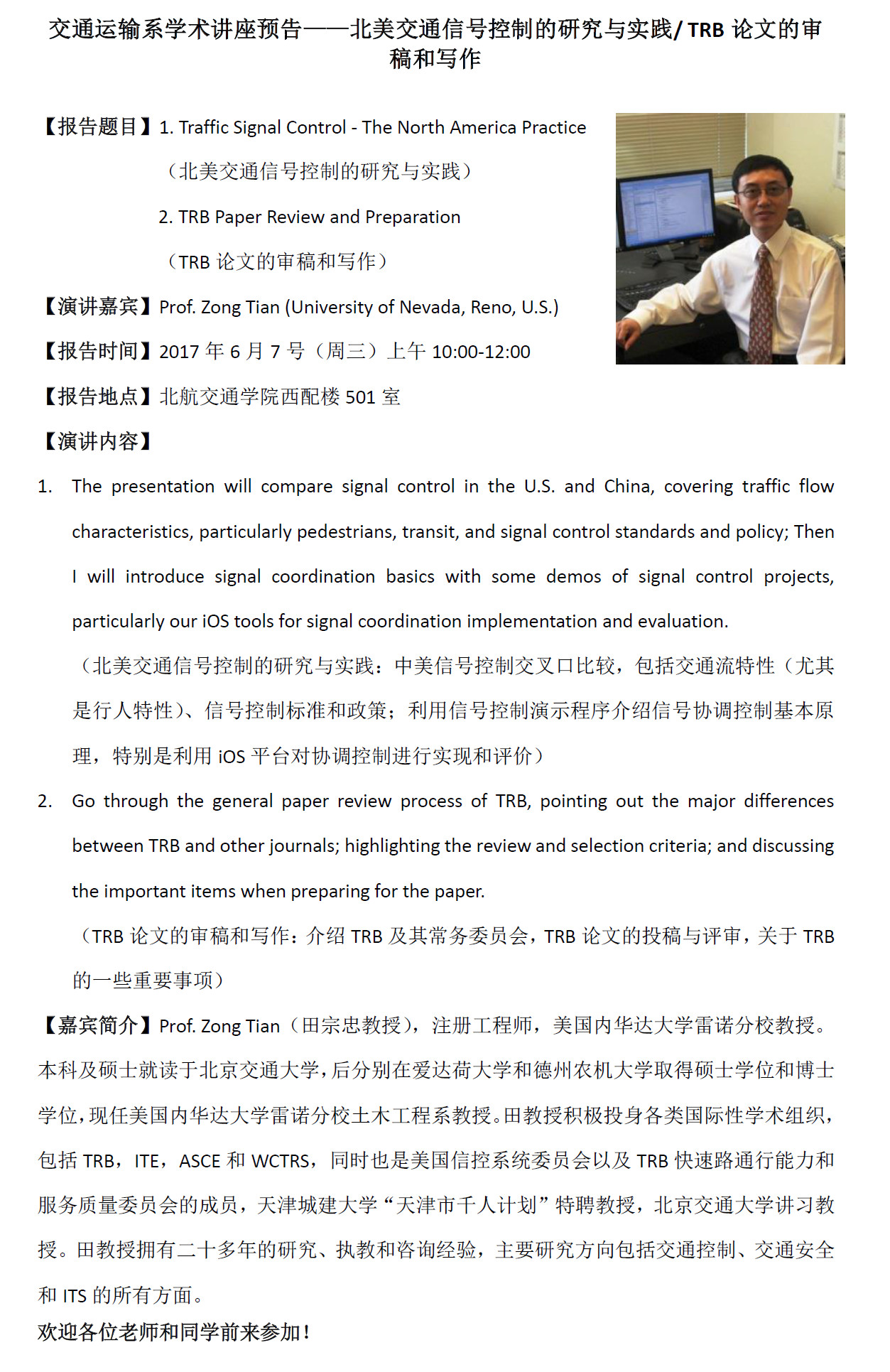 交通运输系学术讲座预告——北美交通信号控制的研究与实践/TRB论文的审稿和写作