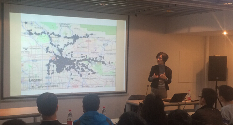 本次报告中,Cynthia Chen教授主要讲述了如何通过用户按照时间序列得到的空间位置来判断用户的空间行为活动。会议开始,Cynthia Chen教授介绍了数据获取的途径并分析了不同途径的优劣,报告中的数据是采取被动采集方法,保证了数据的连续性,并根据用户的电话GPS系统获得地理位置数据,并提供了被动采集的优化方法,最终基于模型的聚类算法,综合考虑距离、时间以及密度等因素,可以判断出位置的使用类型(比如上班地点、工作地点等等),最终结论也表明:1、通过一个人过去一段时间的手机位置信息,我们可以很好的定义他出行轨迹中的一些关键点;2、在未来,这些被动产生的数据调查将来很有可能代替家庭出行调查。