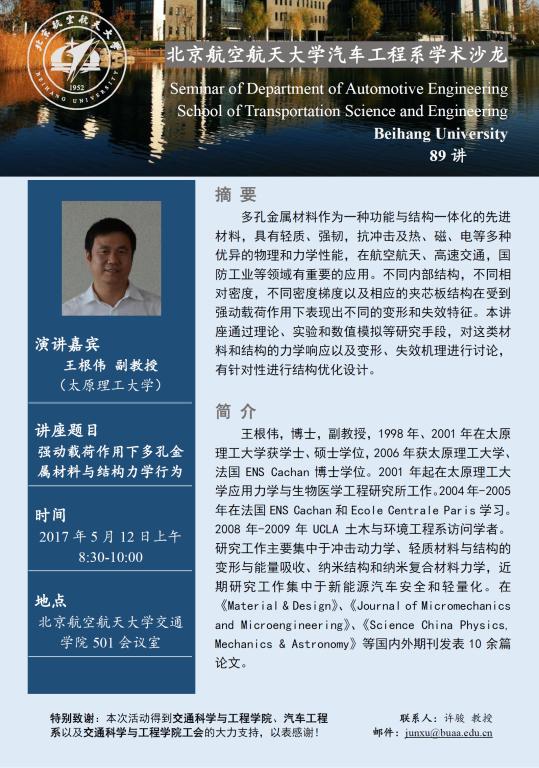 汽车工程系学术沙龙第89讲预告——强动载荷作用下多孔金属材料与结构力学行为