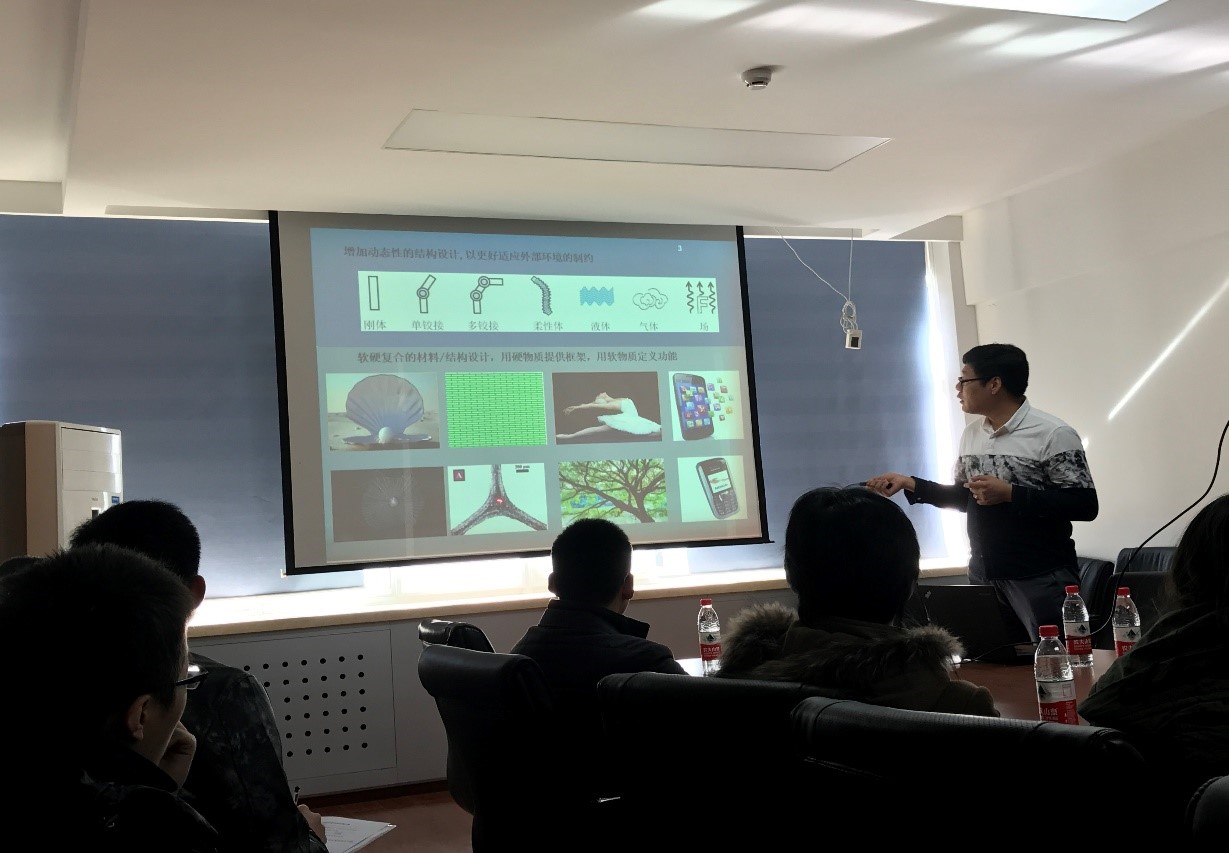 在报告会上,张凯老师结合自身多年的研究经历,表达了自己对材料发展趋势的独特见解,提出“材料可以通过增加结构的动态性,以适应外部环境的制约”的观点。随后,张凯讲师对“超材料(metamaterial)”这一概念进行了分析说明,超材料是一种具备人工结构的复合材料,具有一些自然界材料不具备的超常物理特性,而且它的性质由人工结构决定。另外,从贝壳,蜘蛛网等结构得到启发,张凯讲师认为通过借助增材制造技术,增加材料新的自由度,可以实现材料的智能化。