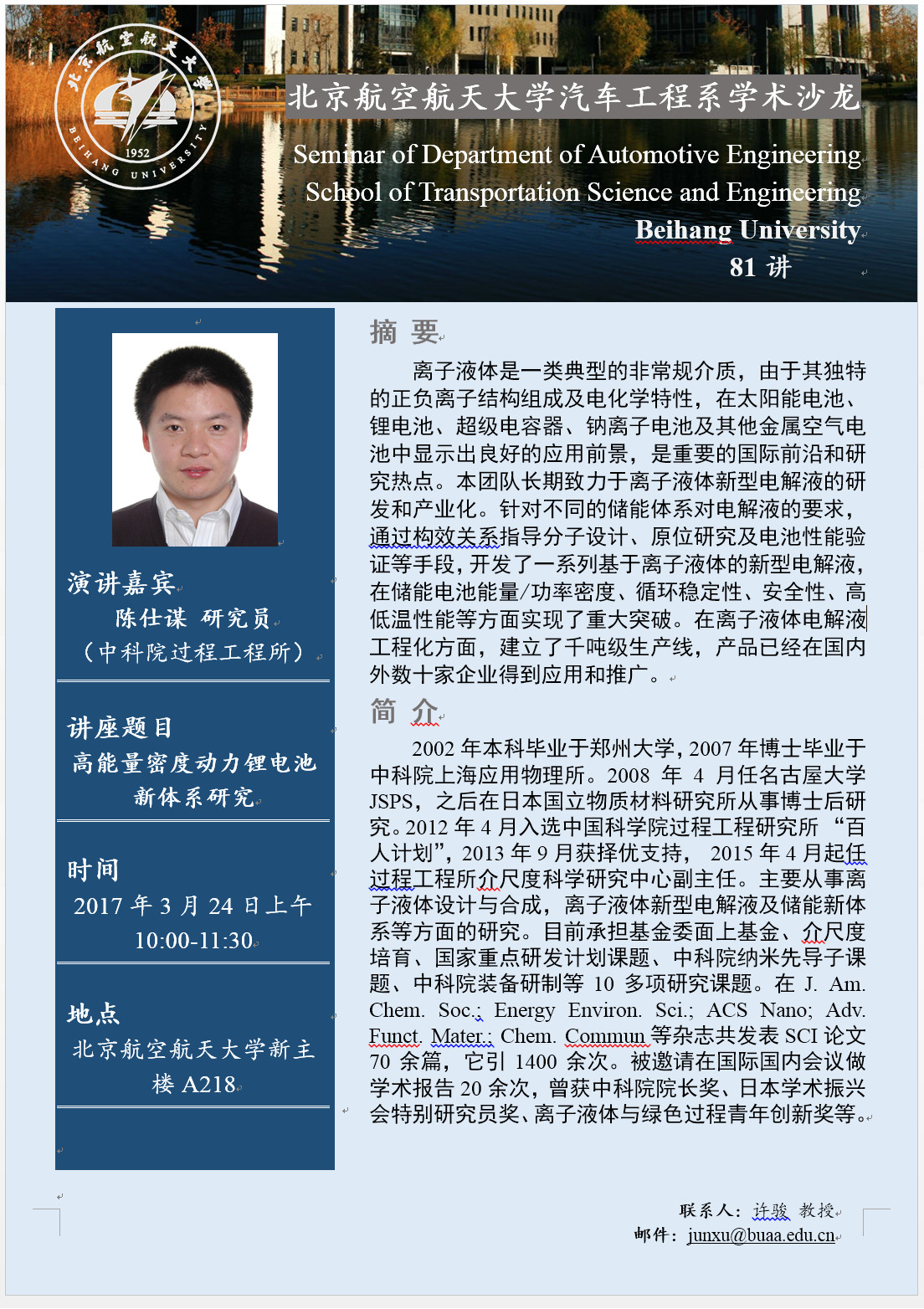 汽车工程系学术沙龙第81讲预告——高能量密度动力锂电池新体系研究