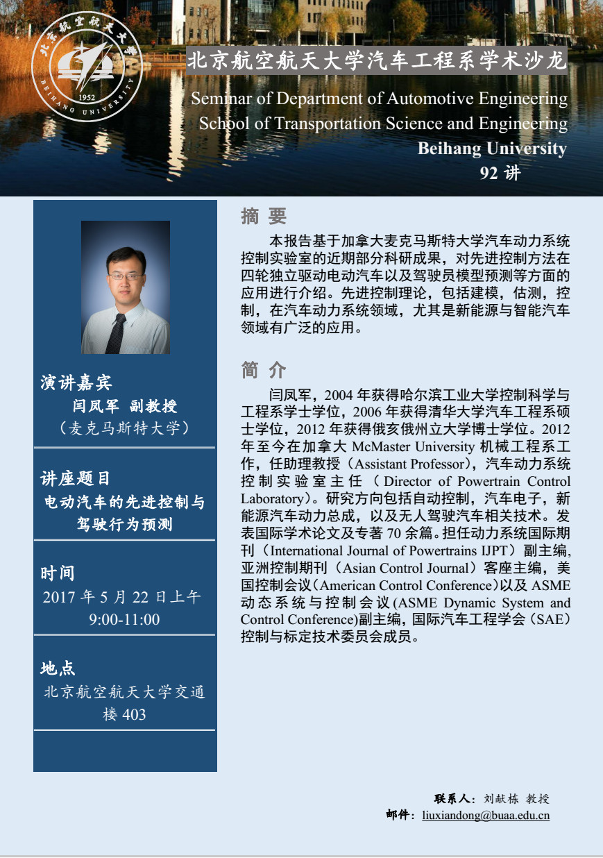 汽车工程系学术沙龙第92讲预告—电动汽车的先进控制与驾驶行为预测