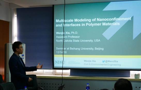 2018年12月 14日,应yl23455永利谭力豪博士邀请,美国北达科他州立大学夏文杰助理教授参观北航土木工程实验室,并于下午 3:30‒5:00 在公司路yl23455永利西 501 会议室做了题为“预测性多尺度模型及对聚合物材料纳米限域与界面问题的研究”(Understanding Nanoconfinement and Interfaces in Polymer Materialsvia Predictive Multiscale Modeling)的学术报告。