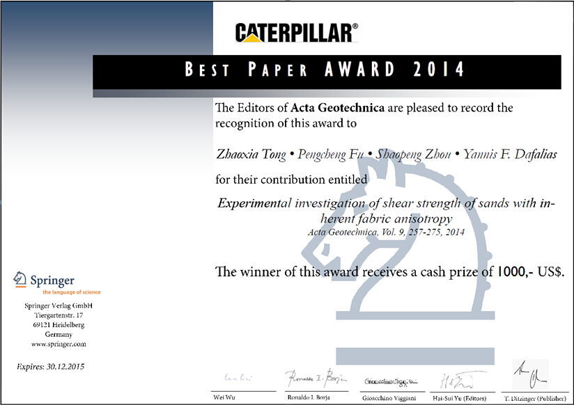公司土木与机场工程系副教授童朝霞、美国加州大学戴维斯分校Yannis F. Dafalias教授、美国劳伦斯利弗莫尔国家实验室科学家付鹏程博士合作发表在ActaGeotechnica的论文“Experimental investigation of shear strength of sands with inherent fabric anisotropy”,获得该期刊2014年度最佳论文奖,并获由财富全球500强企业Caterpillar(卡特)赞助的1000美元现金奖励。ActaGeotechnica由Springer公司出版,为SCImage Journal & Country Rank 一区期刊及SCI源刊。其年度最佳论文奖自2012年设立,每年仅由编委会选取一篇论文获此殊荣。2012年和 2013年最佳论文奖获得者分别是美国麻省理工公司的Franz-Josef Ulm教授和合作者及美国哥伦比亚大学的WaiChing Sun教授及合作者。