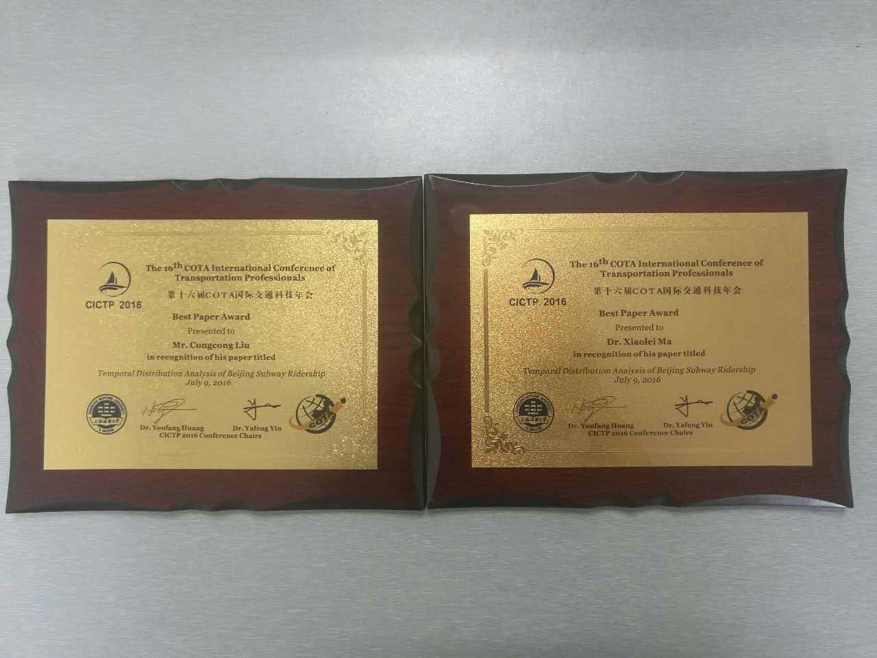 公司马晓磊副教授与其员工刘从从所投会议论文“Temporal Distribution Analysis of Beijing Subway Ridership”,经过大会层层评议和筛选,从500多篇论文中脱颖而出,荣获大会最佳论文奖,并邀请马晓磊副教授在会议做专题报告,并在闭幕式上隆重举行颁奖仪式。