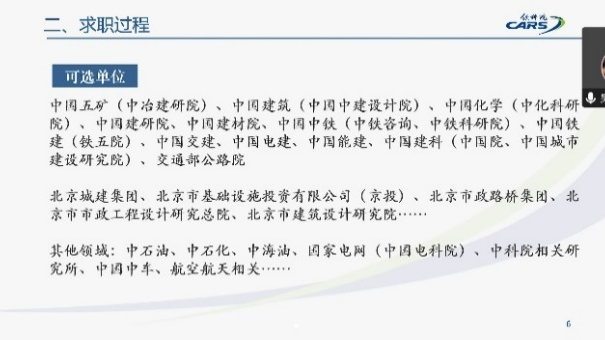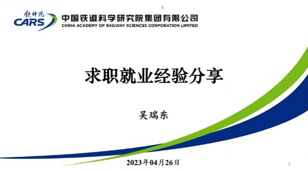 吴瑞东同志在分享报告中以中国铁道科学研究院入职经历为主线,从单位介绍、求职过程、行业要求等方面,对求职过程中的心路历程、总结思考和关键细节娓娓道来。吴瑞东同志列举了可选单位,总结了“工作地点-就业去向-平台与个人发展”三个考虑因素,鼓励同学们把握机遇、立足自身条件拓宽求职思维。