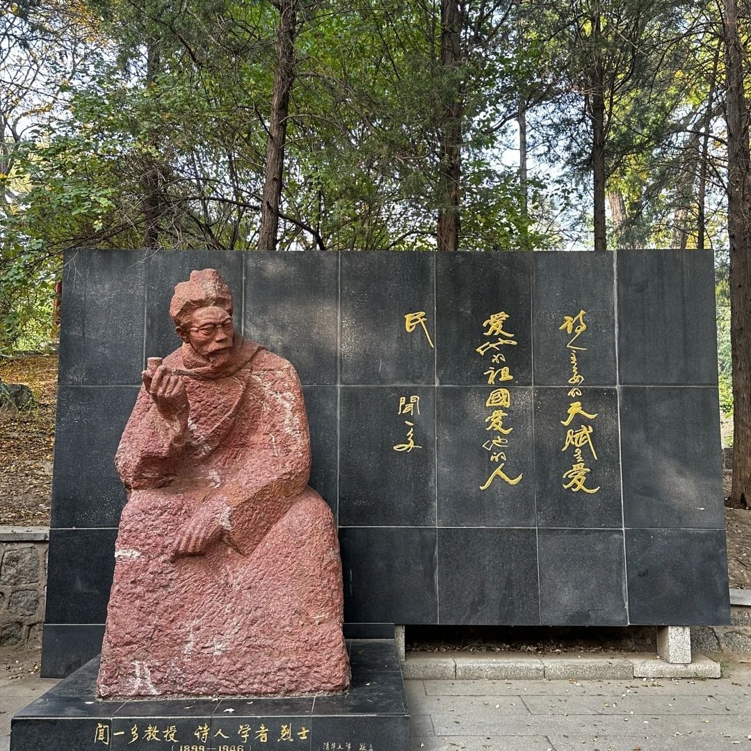 闻亭是一座古式六角亭,原为一座钟亭,建校初即有之,为号令全校作息而设。曾任清华大学中文系主任的闻一多是中国著名的诗人、学者。抗日战争期间,他目睹国内反民主的独裁政治,拍案而起,1946在昆明被暗杀。闻一多用生命诠释了何为不畏强暴、威武不屈的民族气节,何为舍生取义、视死如归的士人风骨,我们站在闻一多先生的雕像旁,苍松翠柏间,先生仍旧身着长衫,手握烟斗,用亲切刚毅的眼神注视着来往的同学和游客们,仿佛时刻在殷切的告诉我们,爱我们的祖国,时刻不忘!