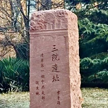 最后,我们跟随志愿者的脚步来到三院遗址,纪念物正面,镌刻着百岁老学长宋平题写的“三院遗址”以及魏碑体的“清华第一个中共支部诞生地”。纪念物顶部,以三院主体建筑薄浮雕的形式慢慢渐显,象征党的革命立场,逐步发出耀眼光芒;从另一个角度看,则是慢慢渐隐,象征随着时代前行,老三院在岁月中慢慢隐去,为新的建筑代替。今天,我们在此,与清华党支部一起,传承先辈精神,做好党支部建设这一关!