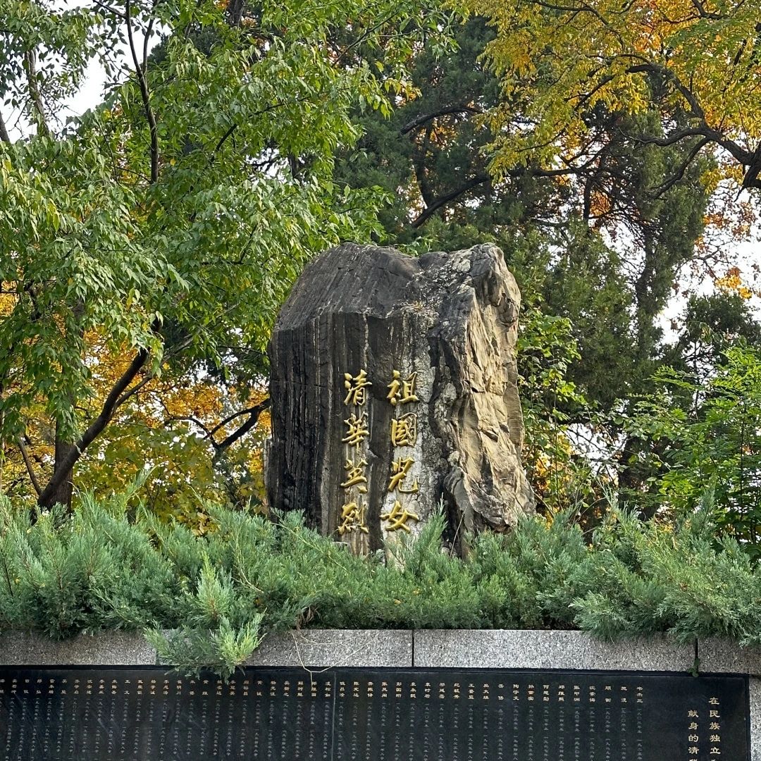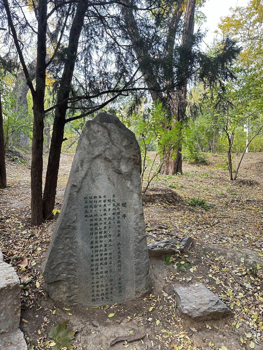 首先来到第一站——清华英烈纪念碑,清华英烈纪念碑位于“水木清华”北山之阴,落成于1989年9月28日,碑高2米,正面书写“祖国儿女,清华英烈”八个铜铸大字,背面(重塑碑身后已移至正面)刻有“在抗日战争和解放战争时期献身的清华英烈永垂不朽”字样,经过长期的史料研究,碑上英烈的名字从2001年的43位演变成了如今的64位,每一个名字的背后都是一段可歌可泣的故事,都代表了为祖国献身英勇无畏的英烈精神。同学们在碑前沉默站立,志愿者的声音在不断给我们讲述当前的故事,我们也仿佛听见了前辈们对我们的殷殷期盼。