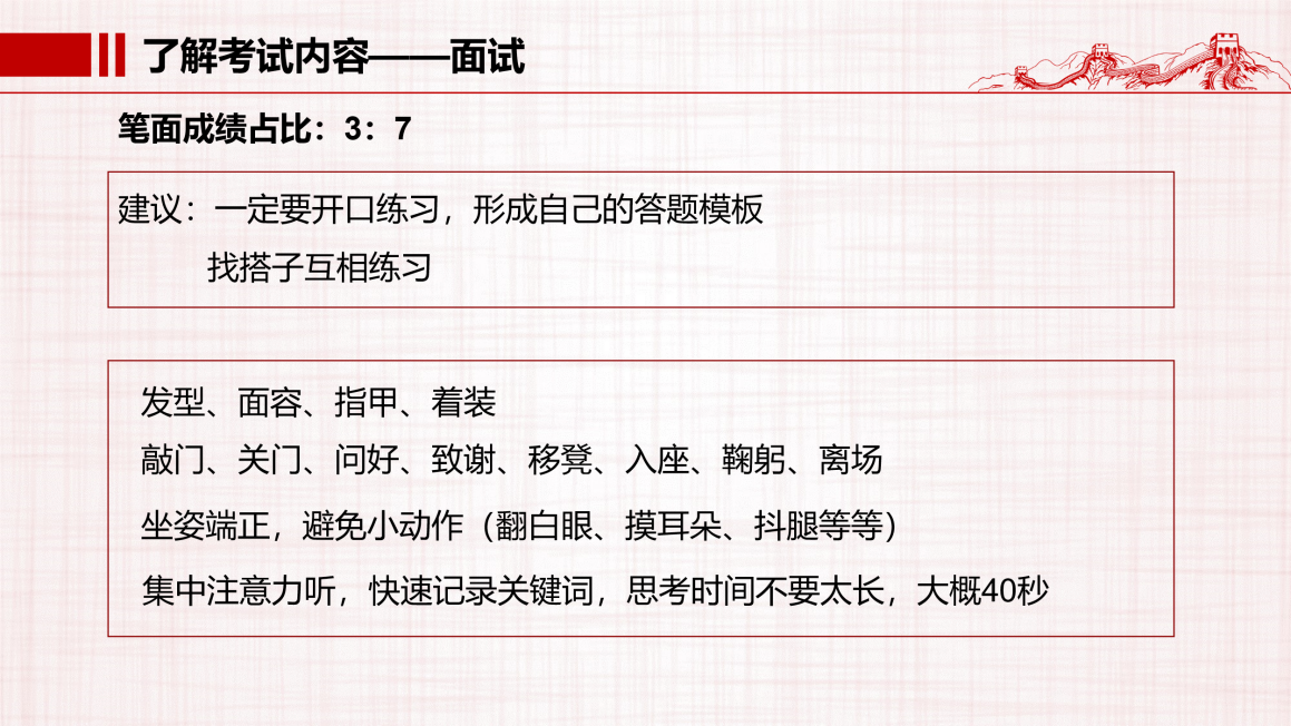 之后,高新丽对选调的笔试内容进行了细致的介绍,包括试题类型分布,重点题型及注意事项等,并分享了自己的总体复习计划,为大家提供参考。对于面试环节,高新丽从自身面试经历出发总结了几点注意事项,建议大家一定要常开口练习形成自己的答题模板,并在面试时注意行为举止和穿着打扮等。