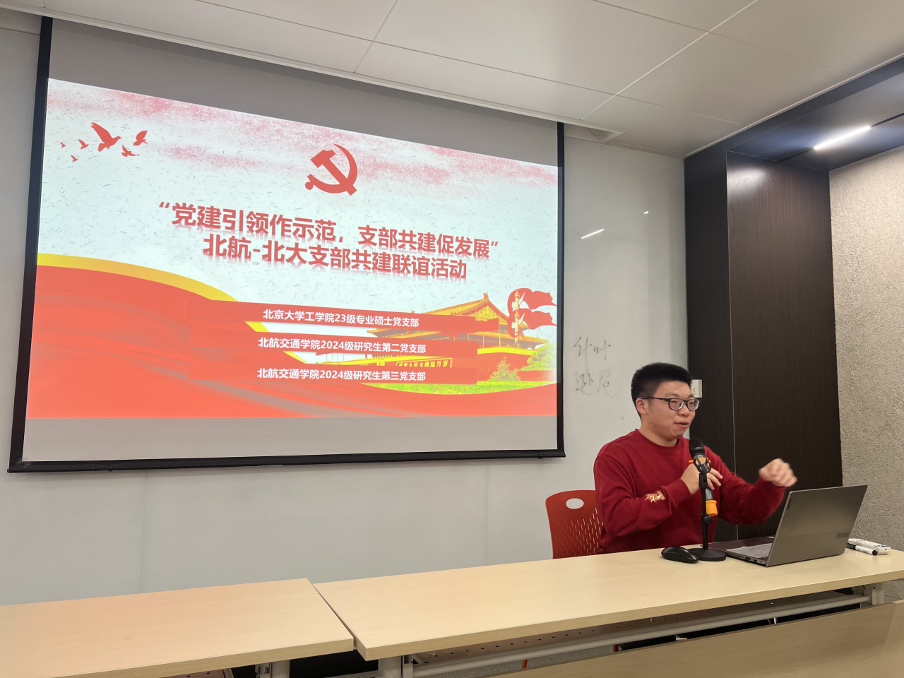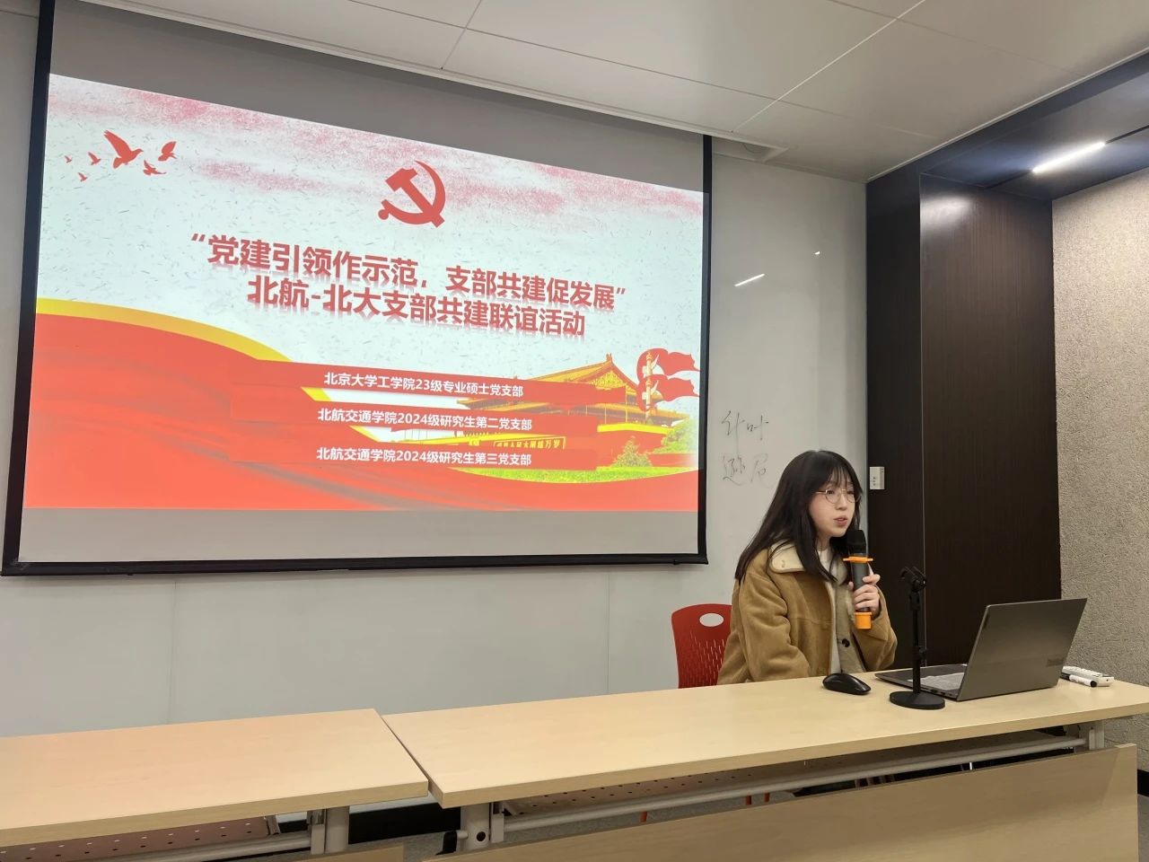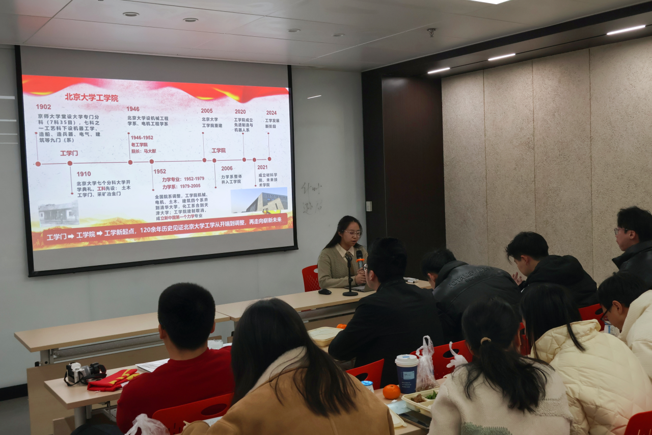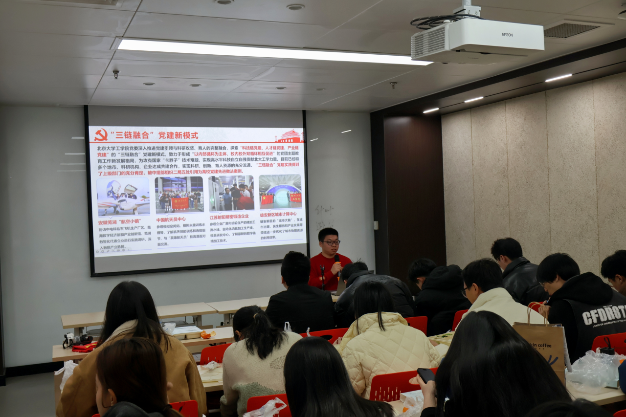 林撼昕讲解了北大工公司探索形成的“科技链-人才链-产业链”的“三链融合”党建新模式,和“以内部循环为主体,校内校外双循环相互促进”的党团主题教育工作新发展格局。北大工公司23级专业硕士党支部书记徐博涵介绍了北大工学的百年历史沿革,分享了党支部推进“学习型、专业型、服务型”支部建设的经验。
