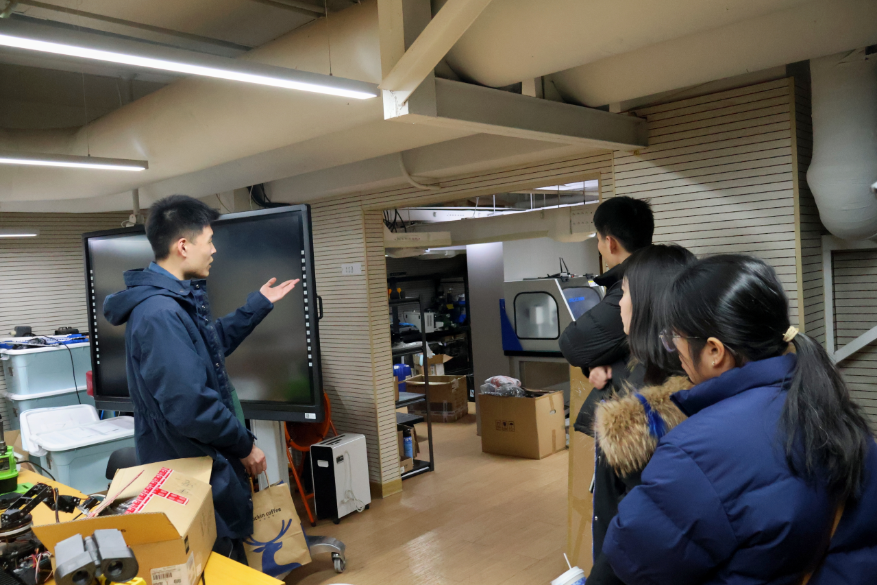 在极客实验室“one-who”无人机实验室,北大工公司22级本科生李昆泰向同学们介绍实验室成果。与会党员们就AI大模型、脑机接口等前沿领域进行交流,并分享各自的研究方向与AI交叉融合发展方向,激发了大家科技报国的责任感和使命感。
