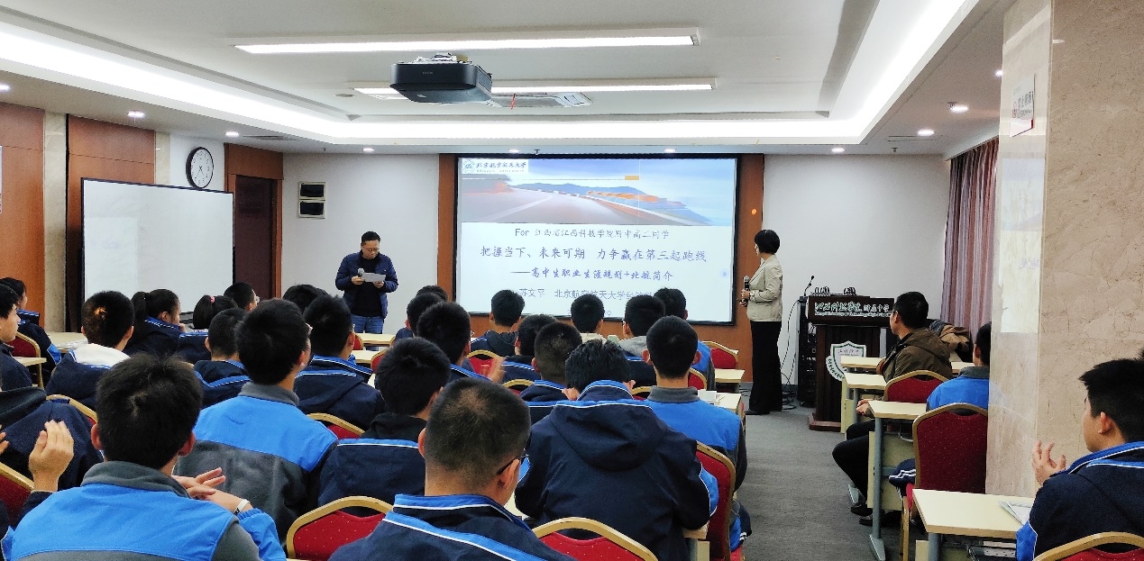 11月29日,招生组抵达江科附中,继续进行招生宣传与学术交流活动。苏文平教授为高二年级的员工们带来了以《把握当下,未来可期,力争赢在第三起跑线——高中生职业生涯规划与北航简介》为主题的讲座,讲座内容深入浅出,为员工们提供了科学的职业生涯规划路径,也激发了同学们对北航的兴趣。