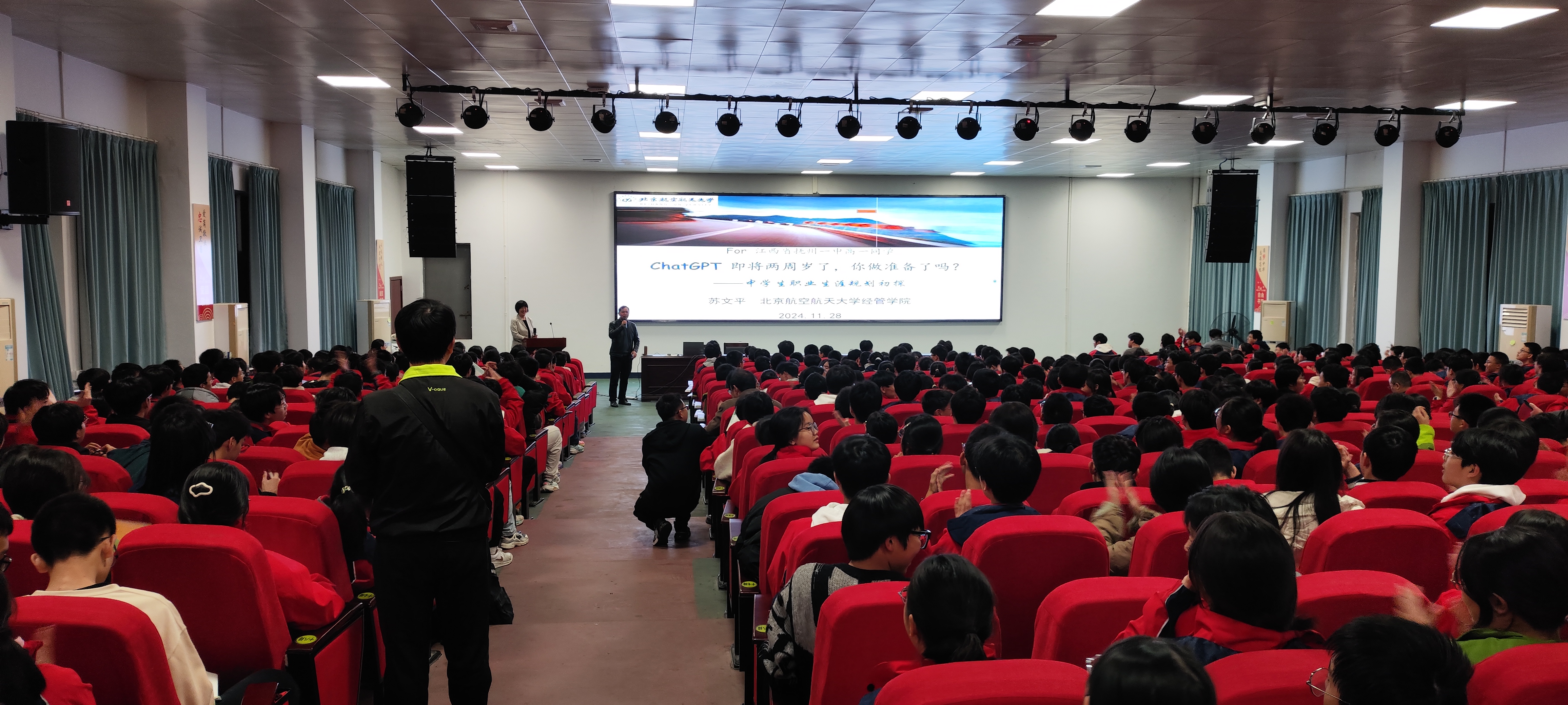 11月27日,北航招生组抵达抚州一中,与校领导就近年来的招生情况展开了深入交流。招生组详细介绍了北航的学科专业、招生政策以及录取分数,全面展现了北航在空天领域的学术优势。授牌仪式后,苏文平教授为高三员工带来了主题为《把握当下,未来可期——高中生职业生涯规划》的讲座。讲座通过结合社会行业趋势和职业机会,帮助同学们了解如何认识自我、规划职业生涯,为高三员工在高考后填报志愿提供了科学指导。同时,苏教授也向同学们介绍了北航的学科设置与培养特色,传递了“空天报国”的理想信念,激励员工们勇敢追梦。
