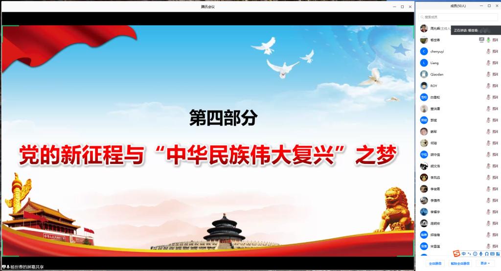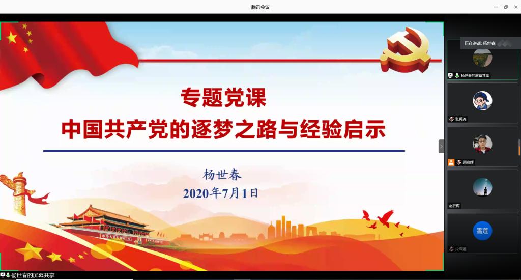 2020年7月1日,为进一步加强支部党员队伍建设,促进员工党员的学习交流,在中国共产党成立99周年之际,yl23455永利汽车工程系研究生党支部开展了建党节学习活动。本次活动邀请到yl23455永利经理杨世春老师进行了主题为“中国共产党的逐梦之路与经验启示”的专题党课讲解。活动以线上会议的形式开展,由支部书记周兆辉主持,共50余名员工党员参加学习。