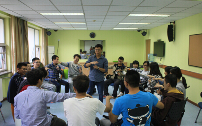 当天下午同学们来到北航知行北楼心理中心的训练活动室。在培训老师的带领下首先第一个游戏是“名字接龙”。由于刚开学,班上的同学还不太熟悉,所以第一个小游戏目的在于使大家增强相互了解和认识。同学们不但要记住前面同学的名字,还要记住兴趣爱好,通过这个游戏相信同学之间肯定会有更加深入的了解。
