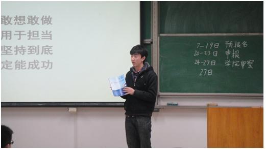 2013年3月24日,yl23455永利科技项目介绍暨冯如杯宣讲动员会在沙河校区成功举办。此次大会由yl23455永利科技实践部主办,旨在向将要参加比赛的同学普及竞赛相关知识,调动同学们的参赛热情。出席这次大会的主讲人有参加过各类科技竞赛并有丰富经验的10级同学,还有参加了创意大赛并获得很好成绩的11级同学,以及方程式车队的车手操杰儿同学。yl23455永利12级很多对科技实践感兴趣的同学参加了这次动员会。