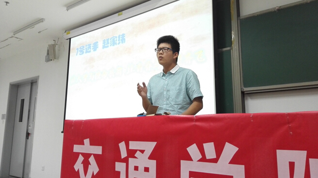 在一段精彩的回顾视频后,2014级辅导员李大伟致开场词,他期待同学们能在老员工活中勇敢地追寻梦想,开拓创新,同学们深受鼓舞并报以热烈的掌声。比赛开始,参赛选手们依次上场,经过初赛的锻炼,他们已变得更加自信从容,在这个舞台尽情地展示自己独到的见解。有同学讲到,大学是梦想绽放的伊甸园,我们应该勇担责任,仗剑前行;也有同学劝告不要沉迷网络,荒废学业,用悔恨纪念自己的青春。所有选手演讲结束后,2012年一等奖获得者王明凯进行总结,他给选手们鼓励,同时也热心地指出他们的不足之处。最终,来自61班的赵佳伟同学荣获一等奖,其他选手也获得相应奖励。