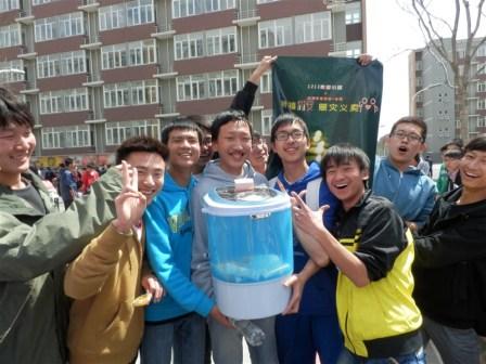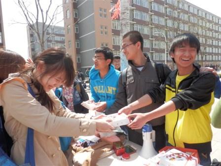 4月24日中午,义卖活动如期展开,新鲜出炉的蛋挞迅速吸引了大家的注意,活动开始不到10分钟就售出30余个,活动当天风大日高,天气条件比较恶劣,但同学们顶住了恶劣天气的影响,滕鑫鑫同学高站在椅子上,始终展着海报,刘艳静、杨帆等同学使足了力气喊喇叭,直到后来喇叭电池耗尽还依然不停宣传,始终保持着我们摊位的高关注度。初期订购的几百个蛋挞迅速售罄,但还不断有人涌过来买蛋挞,见状我们当机立断,又订购一批蛋挞并游说前来买蛋挞的人关注其他商品,在此过程中,成功售出大量小物件。当一名同学买下了我们本次义卖活动的最大件商品——洗衣机之后,活动达到了高潮。我们的摊位前挤满了前来选购的人,各种商品大都寻到了买主。下午两点,活动圆满结束。