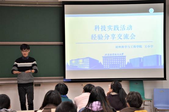 在科技实践交流活动经验分享交流环节中,第十六届“挑战杯”特等奖获得者王小宁介绍了其获奖项目,分享了参加“挑战杯”的经验以及在本科阶段的科研经历及感受,并鼓励本科生在高效学习的同时丰富社会实践与科研经历。