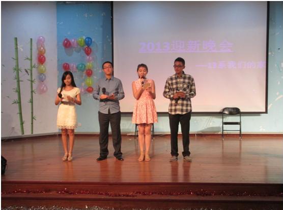 伴随着现场热烈的掌声和欢呼声,迎新晚会正式开始。首先映入大家眼帘的是迎新日由学长学姐拍摄的2013级新生照片,看着小伙伴们一个一个的“亮相”,现场顿时一片欢声笑语。接着,薛鹏宇、聂志鹏两位同学的相声《刚到北航那些事》生动地描绘了大一新生们在北航第一个月的生活,在相声的末尾,薛鹏宇同学深情地朗诵了用2013级133名新同学的名字创作而成的七言诗歌,整诗浑然一体,格调高雅,内容振奋人心,让在场的所有人惊叹创作者高超的文学造诣。相声过后的猜歌游戏将现场气氛推向了高潮,最终,惊爆全场的“麦霸”——来自131314班的刘一超同学勇夺桂冠。游戏之后,由与外系同学合作演出的蒙古族舞蹈《奔腾》、歌曲串烧、单口相声《童年趣事》、小品《中国好员工》都凭借灵活的舞姿、优美的歌声、精湛的演技赢得了全场观众的喝彩。同样,由2013级辅导员王导和2012级员工会成员为大家带来的舞蹈《撑腰》亦可圈可点。最后,晚会在余音绕梁的歌声中结束。