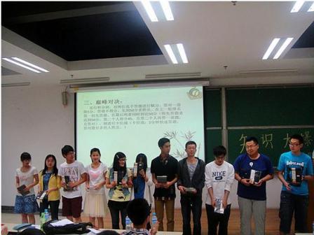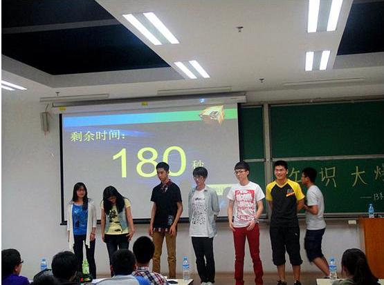 比赛分为两部分:集体赛和个人赛。首先开始的是集体赛。集体赛是以小班为单位参加的,每小班由6名同学参加。集体赛又分为依次答题和抢答环节。在此环节中,各小班“智囊团”纷纷开动脑筋,努力帮助本班冲过首轮。在经过激烈的较量后,12班、14班和央财队成功突围,闯入决赛。在抢答模式的决赛中,14班凭借出色的抢答技巧和扎实的知识功底,最终拿到冠军,而央财队和12班分获2、3名。
