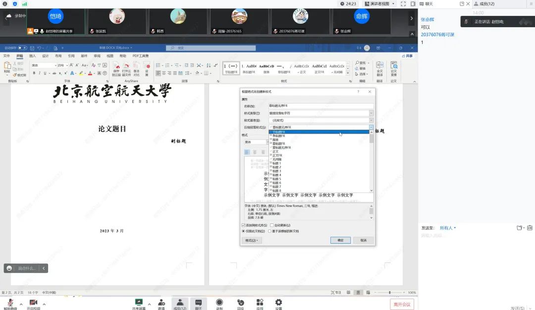 最后,主讲人以“冯如杯”主赛道论文格式为例,手把手带着大家从零开始一起搭建word模板。他详细地讲解了word模板的制作方法、格式设置、页眉页脚等操作方式,让同学们在实践中掌握了论文格式的具体操作方法和技巧。