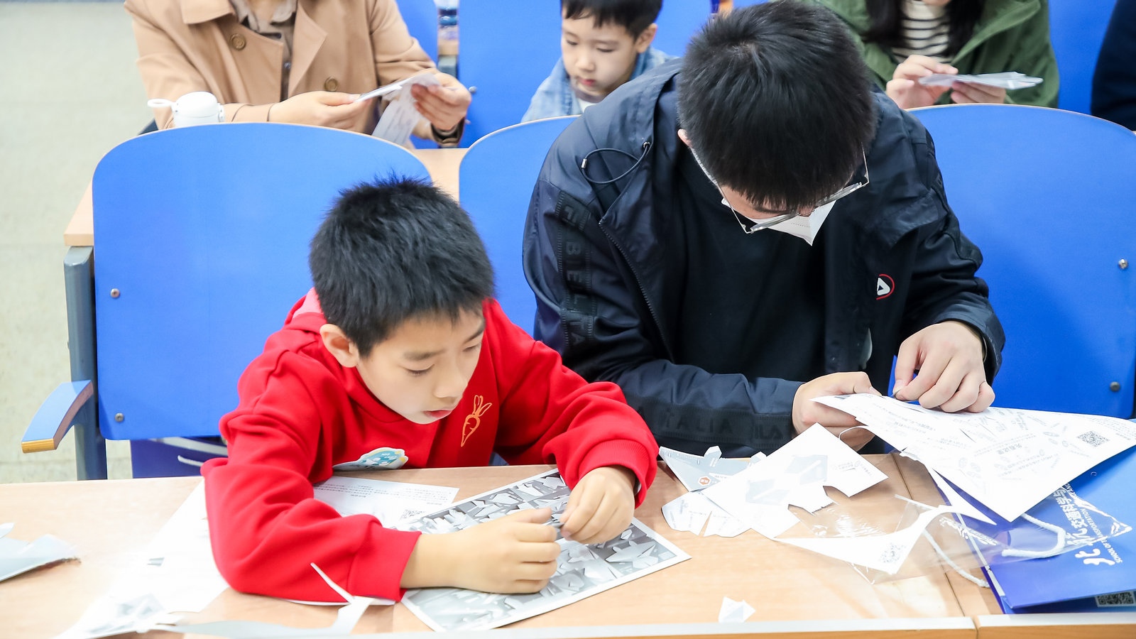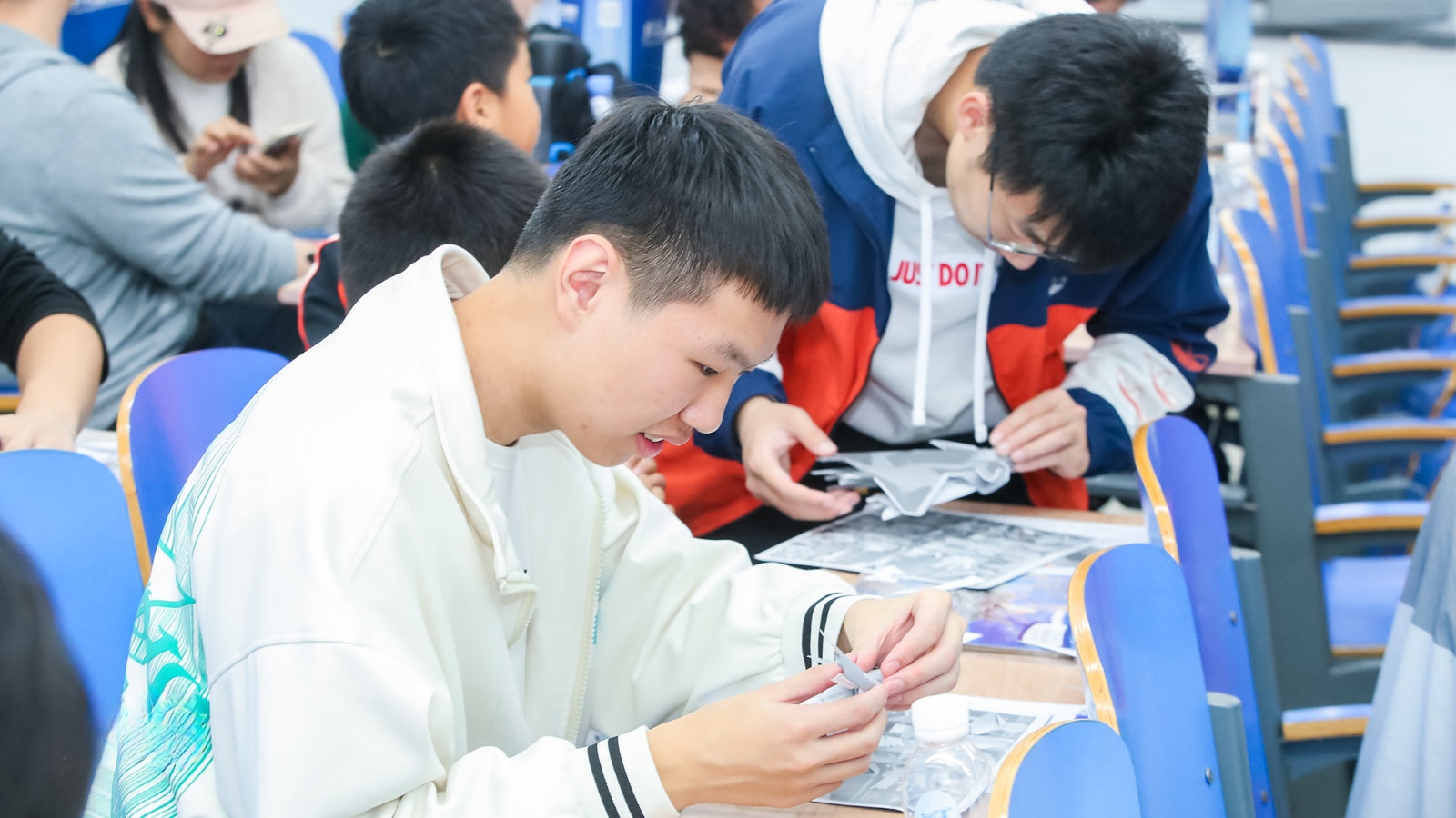 在航模拼装环节,公司志愿者们耐心地为营员们讲解如何参看图纸及折叠注意事项。在志愿者悉心的帮助和指导下,营员们拼出了一个个精美的航模,并将写有青春理想的纸张折叠成形式各样的纸飞机并在新主楼外放飞,让梦想伴随纸飞机远航。