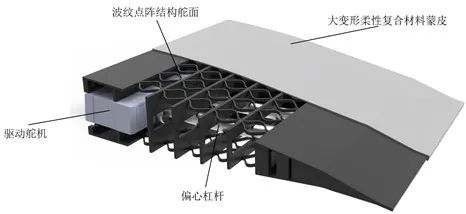 研制一架基于大变形柔性复合材料蒙皮的可变弯度机翼飞行器,该飞行器机翼内侧为可变弯度柔性襟翼舵面,该舵面由大变形柔性复合材料蒙皮、波纹点阵结构舵面、驱动舵机和偏心杠杆四个部分组成,能够实现机翼光滑连续变弯度,该飞行器已成功试飞,并验证其变体功能。该变体方案在未来可用于军机和民机,应用于民机可以提高民用飞机经济性安全性、舒适性环保性,应用于军机可以解决军用飞机不同设计点气动布局的矛盾,改善多功能性,提高经济性及作战功能。