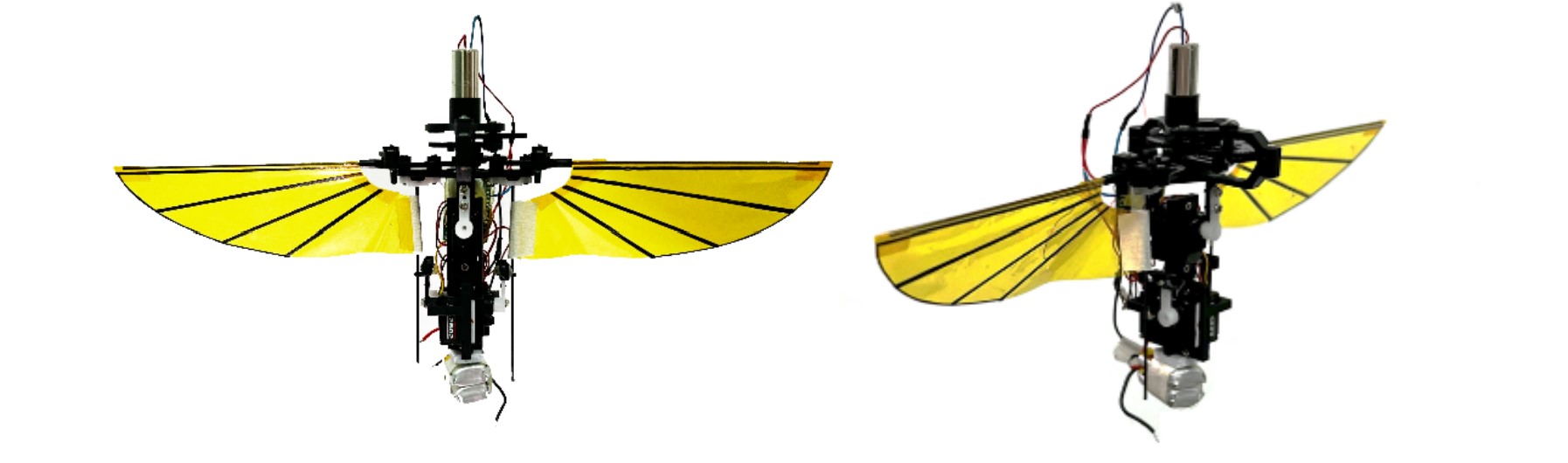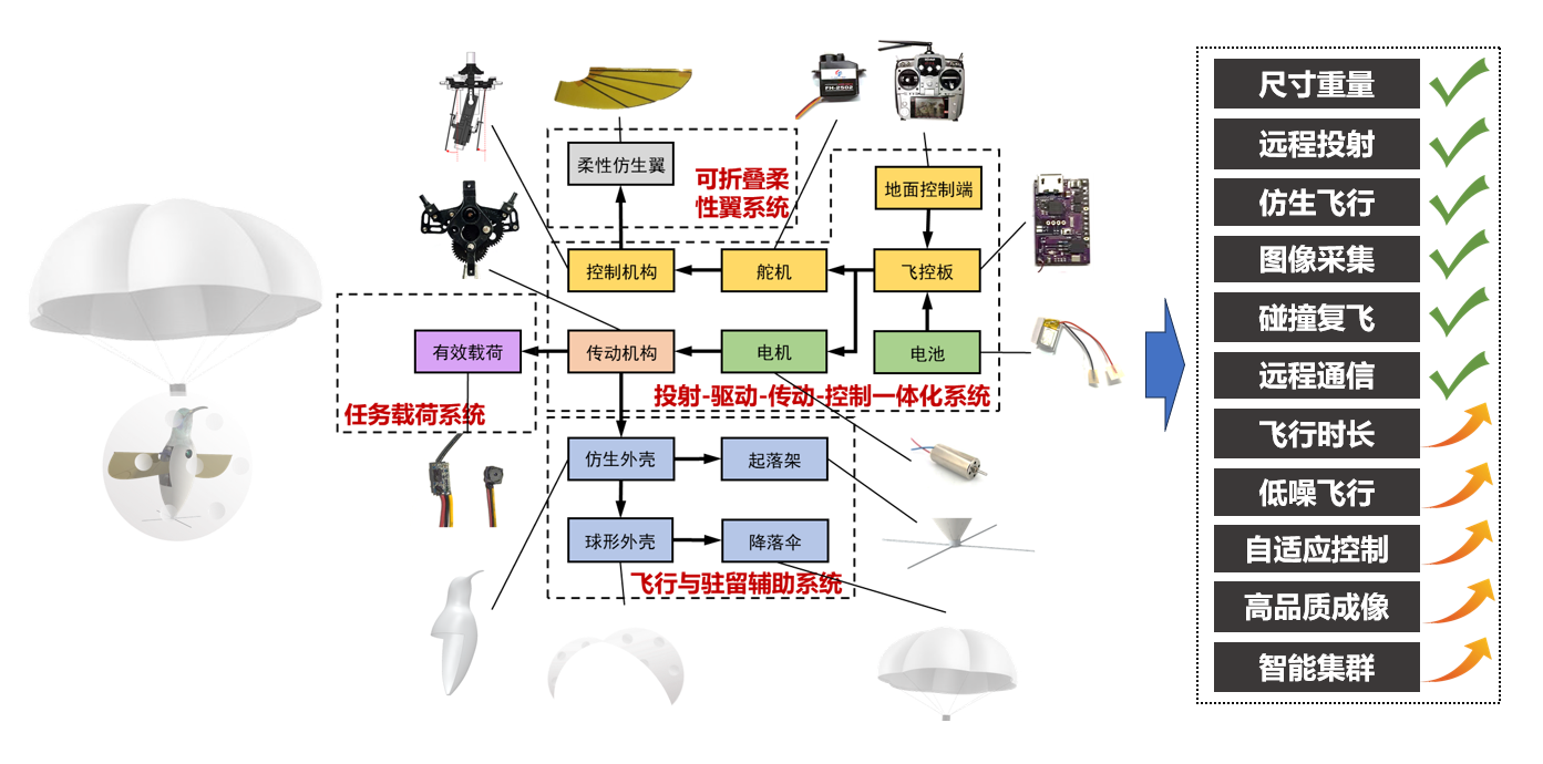 本作品名为可远程投射的仿生微型无人作战平台,是一种基于具备空中悬停、隐蔽性、环境适应能力强的仿生微型飞行器的无人作战平台,集拟态隐身、超强机动、抗扰耐撞、超长运行等多功能于一身,可配合大型飞行器或无人车完成协同作战,在战前阶段开展战场侦察、潜伏监控等任务。该平台包括可折叠柔性翼系统、驱动-传动-控制一体化系统、任务载荷系统和飞行与驻留辅助系统,依据高升力机制设计制造了耐碰撞可折叠柔性翼,用多学科优化的方法设计了驱动-传动-控制一体化系统,通过设计具备拟态仿生、电磁屏蔽、光伏充电能力的多功能皮肤提升了该平台的隐蔽作战能力,可将任务目标的实时图像数据直接回传或配合大型无人机和通讯卫星回传至后端,完善空天地一体化情报侦察网络。仿生微型无人作战平台采用模块化、标准化设计,价格低廉,维护便捷,适宜低成本、大批量使用。
