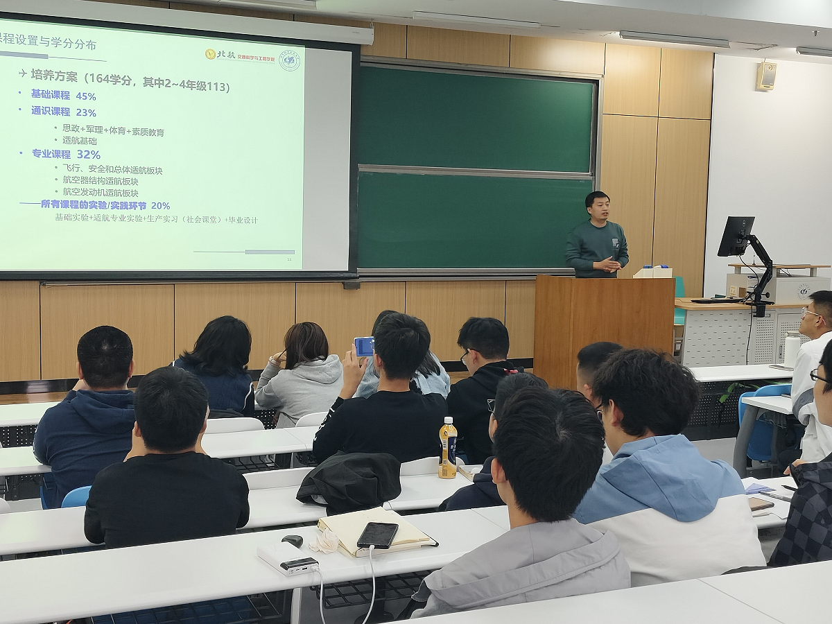 杜锋助理教授介绍了适航专业的培养方案,从课程设置、学分分布、体系规划等方面展开,帮助同学们理解专业特点、知识体系,为同学们专业选择提供参考。
