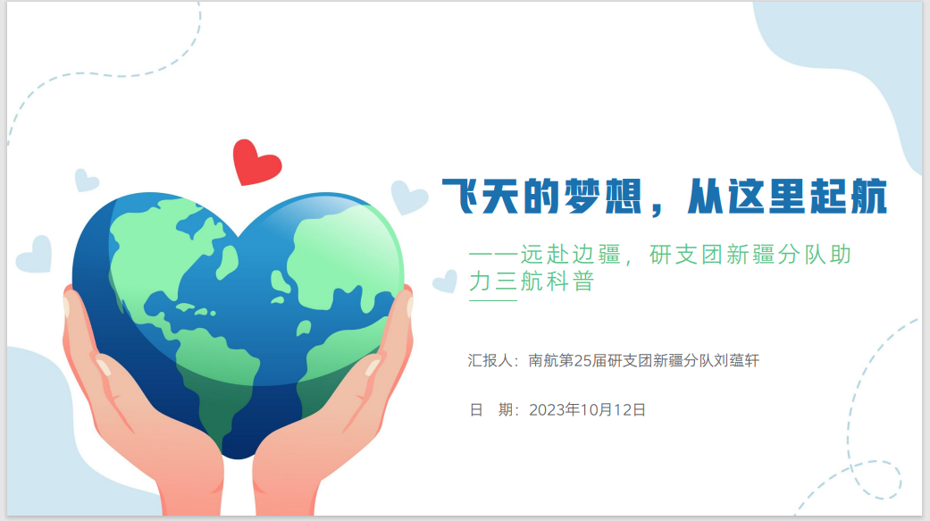 南京航空航天大学第25届研支团新疆分队的刘蕴轩带来了题为“飞天的梦想,从这里起航”的主题演讲。